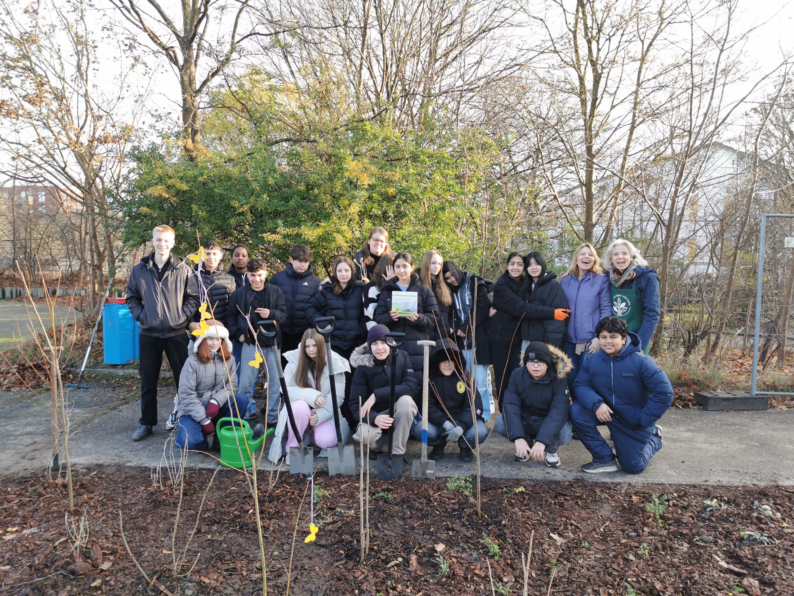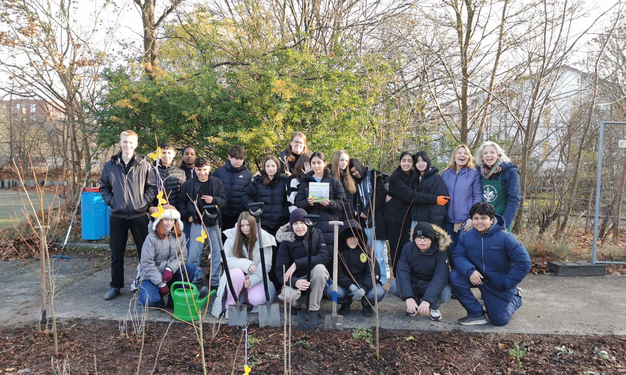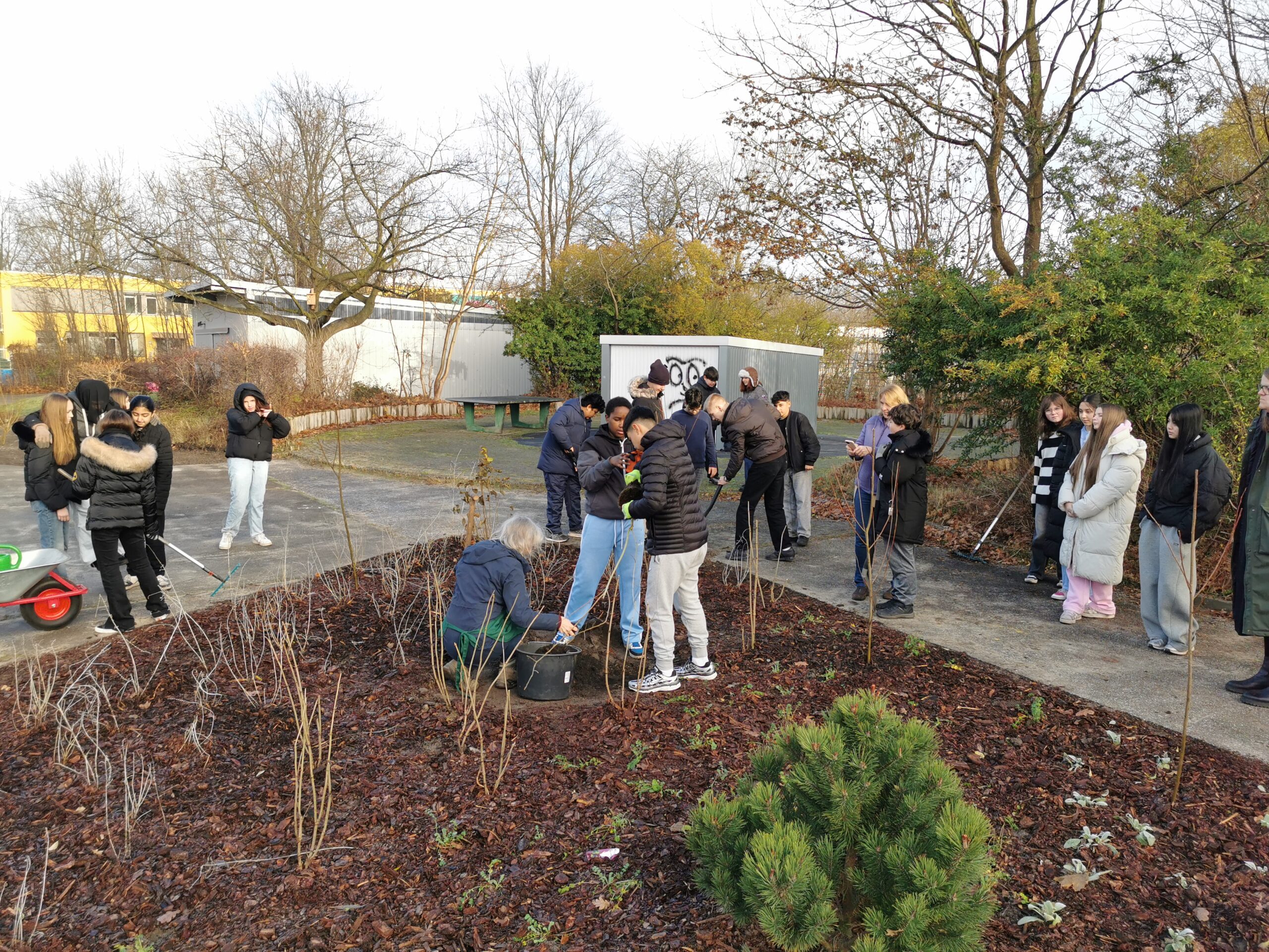 Die Pflanzaktion fand statt auf einer Fläche, die die Schule aktuell gerade entsiegelt und begrünt hat und die sicherlich dazu beitragen wird, unser großes Schulgelände grüner und damit lebenswerter zu gestalten.