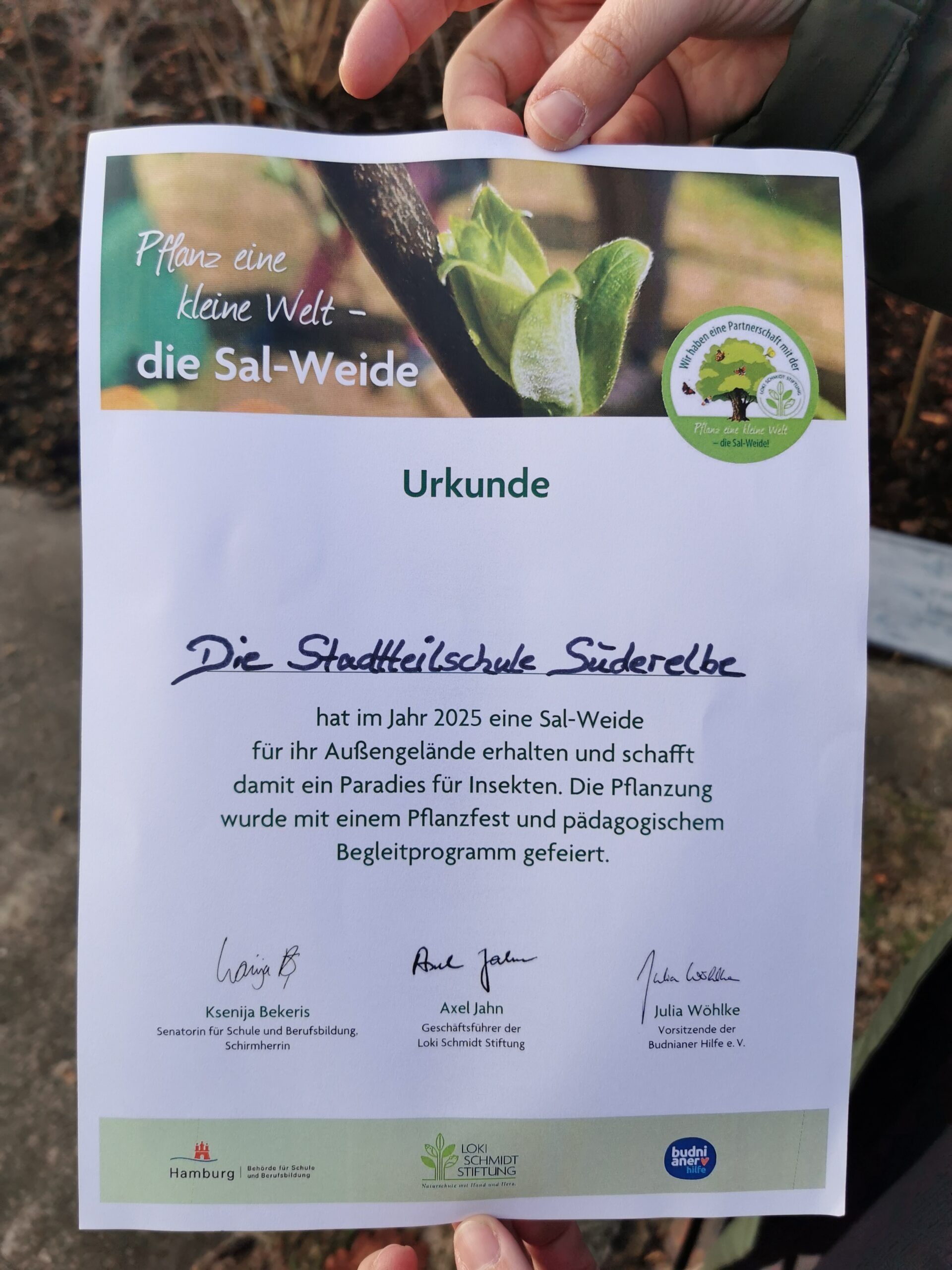 Endlich steht sie: die Salweidepflanzaktion war ein voller Erfolg. Die Klasse 7a hat bei der Aktion viel über den Nutzen von Bäumen und im Besonderen über die Vorzüge einer Salweide gelernt. Nach der fachgerechten Einpflanzaktion haben die SchülerInnen dem Baum noch einige gute Wünsche mit auf den Weg gegeben: Gutes Wachstum, viel Sonne, freundliche Behandlung durch Mitschüler viele Besuche von allerlei Tieren. Die Klasse von Frau Kayser und Frau Faust erhielt eine Urkunde und übernimmt für die nahe Zukunft die Patenschaft für die Salweide. Frau Stehr von der Loki-Schmidt Stiftung freute sich über das Engagement unserer SchülerInnen . Vielen Dank an alle Beteiligten an der Aktion!